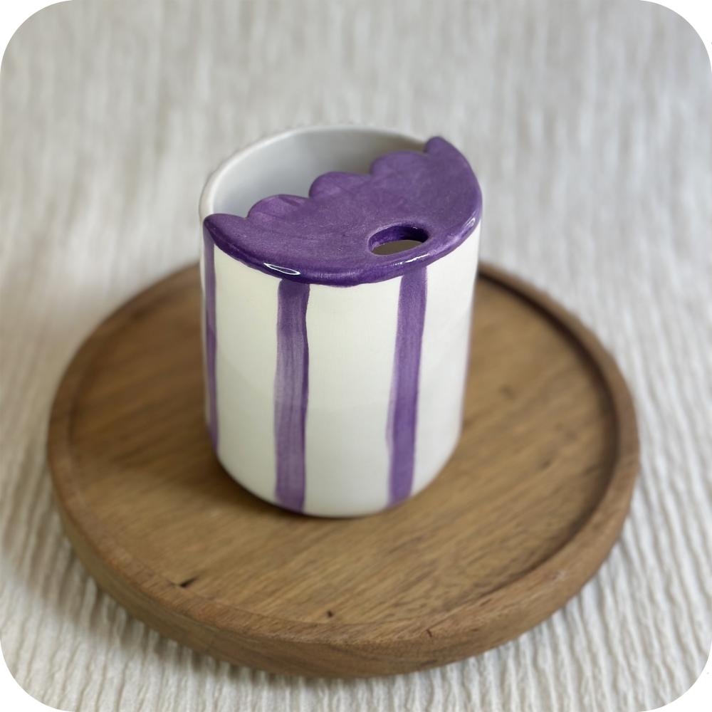 دلل نفسك بمشروبك اليومي مع كوب أنيق مخطط بالبنفسجي برسومات يدوية حرة، حيث تضيف الخطوط المرسومة يدويًا لمسة فنية فريدة لكل كوب. نصف الكوب العلوي مزوّد بغطاء عملي مع فتحة للشرب، مما يجعله مثاليًا للاستخدام اليومي في المنزل أو أثناء التنقل. تصميم عصري يجمع بين الراحة والجمال الفني في كل رشفة